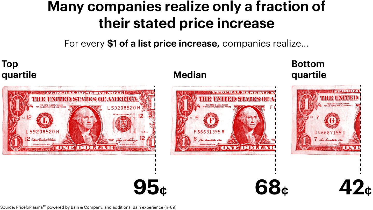 It’s one thing to announce a list price increase, another to actually pass it on to customers. Many business-to-business (B2B) companies end up giving back much of their price increases in the form of discounts, rebates or other forms of leakage. Realizing a price increase requires solid pricing processes, which most companies struggle to maintain. For every $1 increase in a list price over the previous year, the median company realized only 68 cents, according to analysis from PricefxPlasma™ powered by Bain & Company, which compares operational pricing data from a panel of companies. There’s a wide variation: The top quartile of companies realized 95 cents on the dollar, while the bottom quartile took 42 cents. Moreover, this yield is unrelated to the magnitude of the increase; companies with the largest list price increases gave back about the same in percentage terms as those with small increases. Four key components go into realizing a higher price: