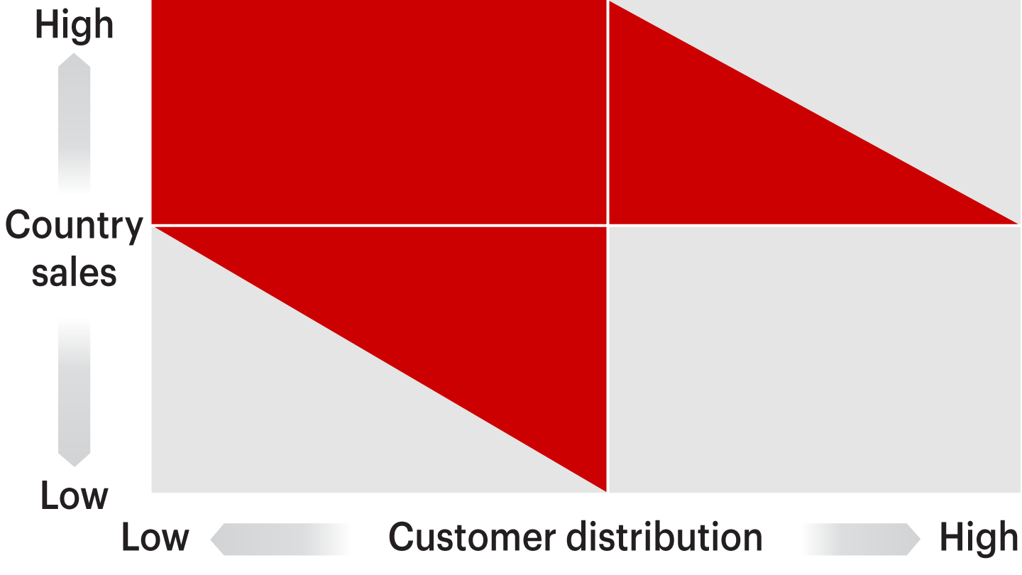 When deciding where to allocate their salesforce capacity, many business-to-business companies base their choices on current and historical spending by customer. Accounts spending more with the company usually get more sales resources. But to attain stronger sales growth, it’s critical to understand each customer’s total potential spending by the relevant product category. Estimates of a customer’s wallet size can be built through heuristic models based on public and internal data that predicts or is a proxy for spending levels. Such data includes the customer’s Standard Industrial Classification code and revenues, number of workers, or number of locations. One enterprise software company estimated the total potential spending of its accounts for each category of information technology it sold. The chart reveals which accounts had little upside (a high share of wallet with low category spending overall) and which had major potential (a low share of wallet with substantial total spending). Based on the analysis, this company realigned resources (including the best sales hunters) to the lower right—large customers for which the company had a low share of wallet.