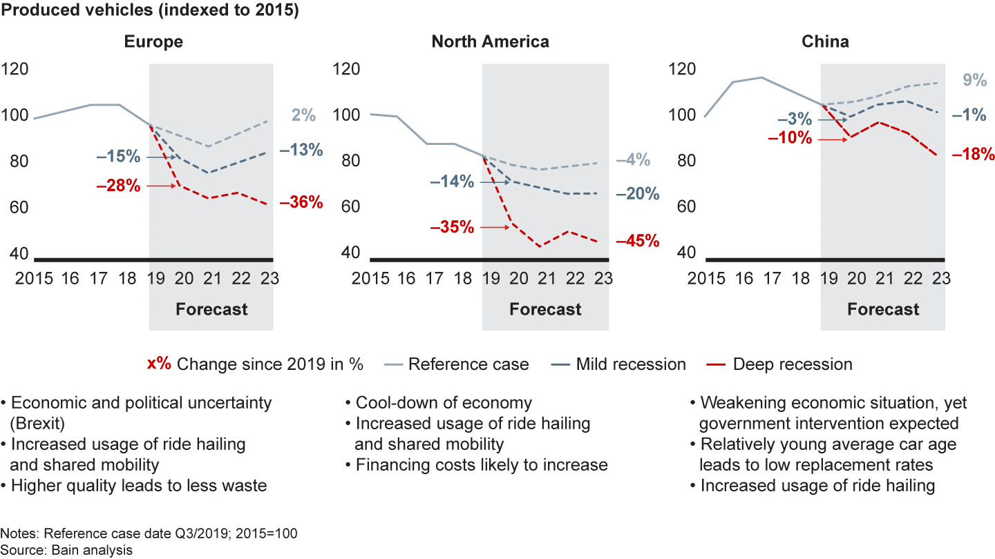 The postcycle new normal cannot be predicted reliably. Production forecasts as well as Bain’s proprietary mild downturn and deep recession scenarios for the post-recovery period all land below 2017 production levels—a grim outlook for additional order reductions for suppliers in 2020 and 2021.