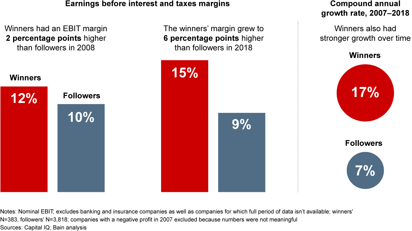 Consumer goods multinational Reckitt Benckiser used the dotcom bubble downturn in 2000 as well as the 2007–2009 recession to invest in brands and digital innovation to outperform peers that underinvested. Focusing on a few high-growth categories, it rapidly rolled out 19 power brands into new geographies. It introduced a new innovation for each power brand every six months and invested heavily in digital tools to improve customer experience and market effectiveness. The gains were significant: Reckitt Benckiser’s earnings before interest and taxes margin rose to 26% in 2010, up from 14% in 2000, and it posted a compound annual growth rate from 2000 to 2010 of 7.4%.
