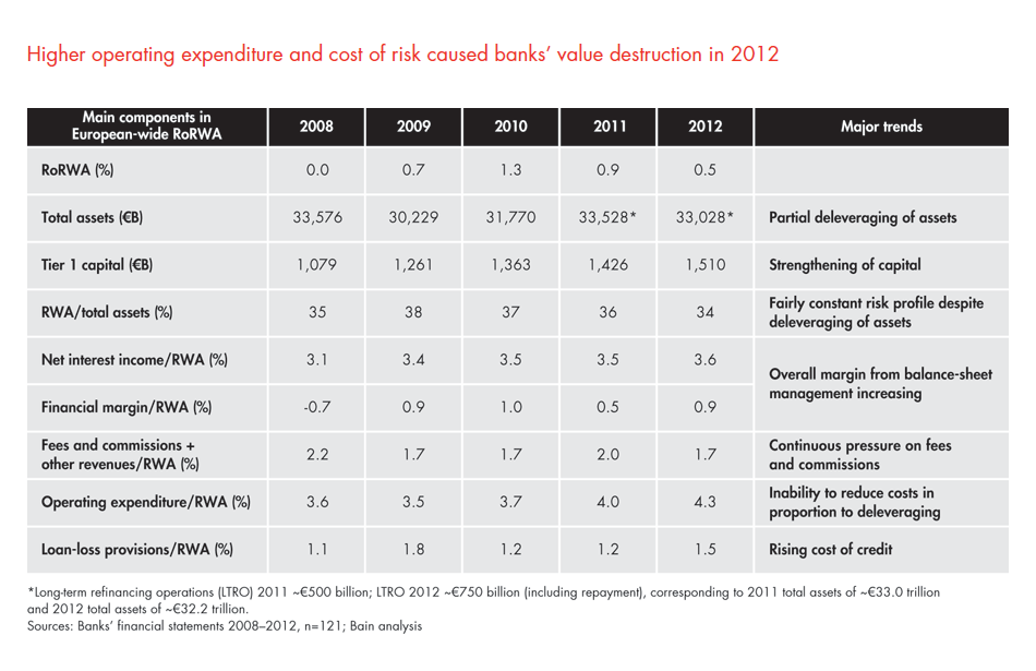 • In 2012, the biggest factors determining significant value destruction were cost of risk, as loan-loss provisions rose, and increased operating cost, which trended up as a percent of risk-weighted assets. More active management of the balance sheet helped raise revenues, but fees and commissions progressively declined.