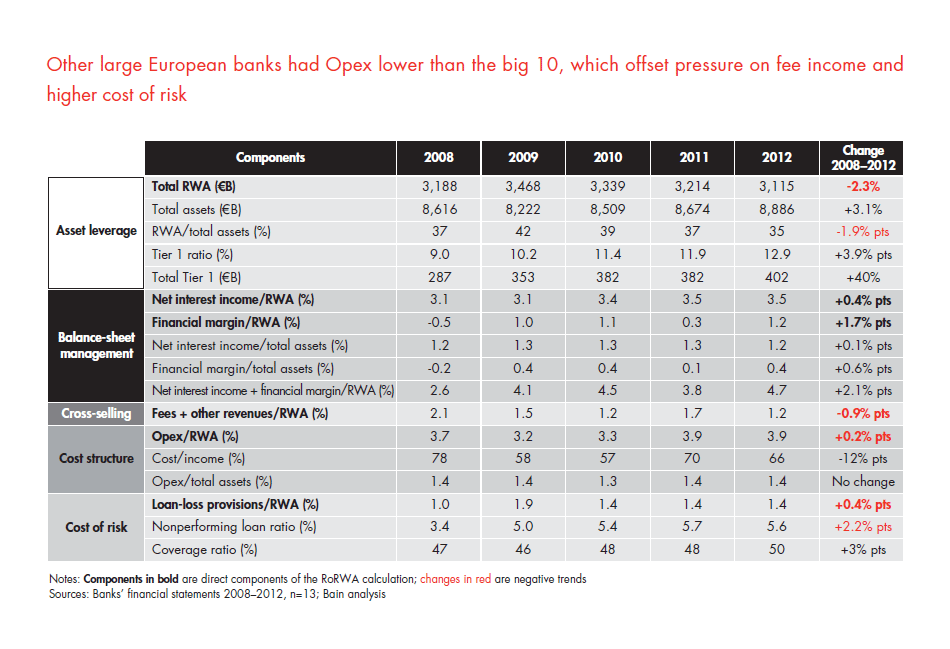The need to shed debt and rely on higher-cost equity to strengthen their balance sheets reduced these banks’ total risk-weighted assets by nearly 8% between 2008 and 2012. Meanwhile, their cost of risk increased sharply, as stagnant or shrinking economies forced them to boost their loan-loss provisions in the face of steeper write-offs of bad credit. Interest margins that remained at low levels, shrinking fee incomes and higher operating costs also added downward pressure to banks’ RoRWAs.
