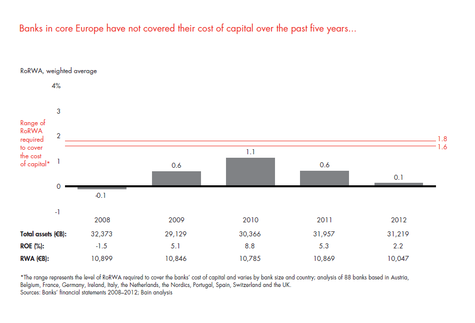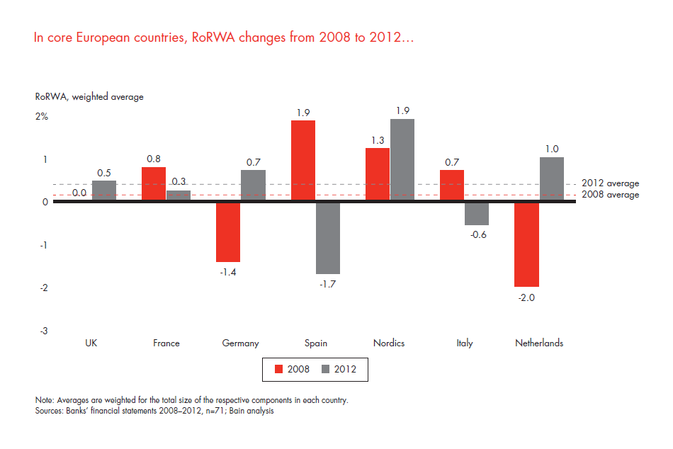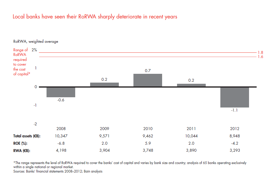Local banks in core Europe struggled, weighed down by nonperforming loans and flat revenues. Their RoRWAs were negative in both 2008 and 2012 and did not come close to covering their cost of capital.