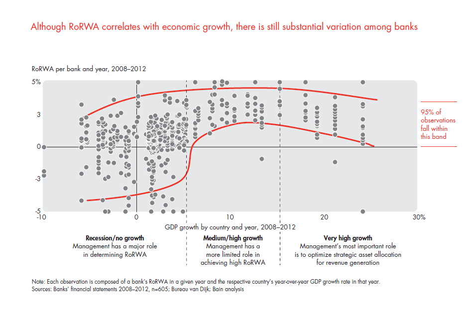 In markets where GDP growth exceeded 5%, by contrast, we found considerably less variation in bank-level RoRWA performance. As the rising tide lifted all banks, management’s role in shaping returns appears to have been more circumscribed.
