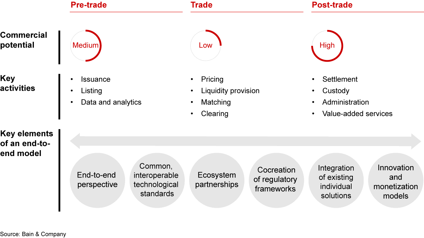 - Four business models have emerged as viable over the near term. To succeed with each, market participants should take an end-to-end perspective along the entire value chain, from issuance through trading and custody.