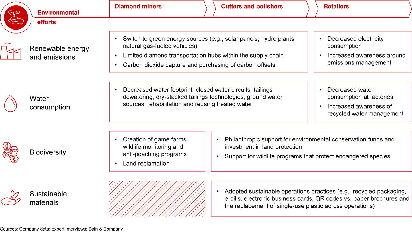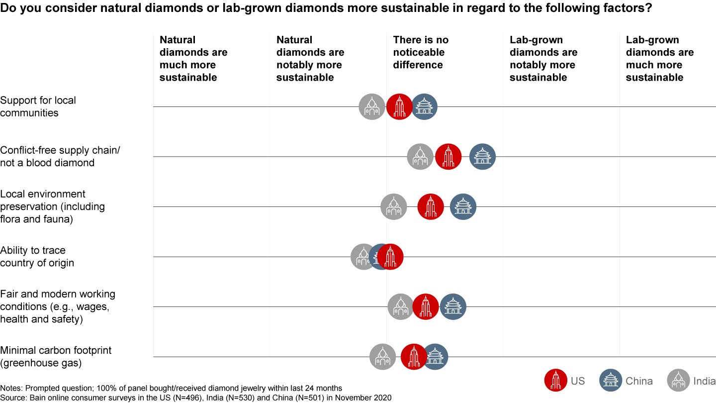 - Sustainability and social consumerism became more influential to purchase decisions, and the pandemic heightened attention to global health and safety concerns. Regarding diamond jewelry, social impact is the top sustainability concern for US consumers; in China and India, consumers care most about environmental preservation, conflict-free supply chains, and carbon footprint. Governments, professional groups, and local communities are pressuring the industry, too. Companies along the value chain are responding with a wide range of initiatives, including capital projects to reduce emissions and diversity and traceability programs. Going forward, industry players should integrate ambitious environmental, social, and governance (ESG) targets in their asset plans and internal incentive schemes to demonstrate their commitment. They should also communicate their progress to society.