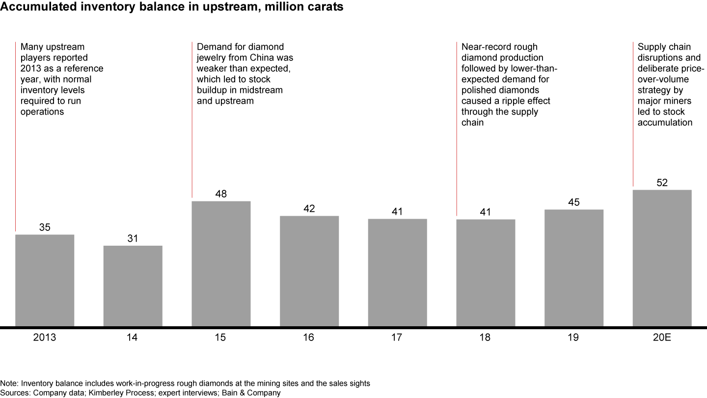 - The mining response at the start of the Covid-19 crisis helped midstream players weather the worst of the storm. Major miners canceled sales in the first half of 2020 and allowed clients to postpone purchases. Upstream inventories of rough diamonds grew to 65 million carats by the end of the third quarter, before decreasing on the strength of fourth-quarter sales to 52 million carats (+17% than the inventory level at the end of 2019).