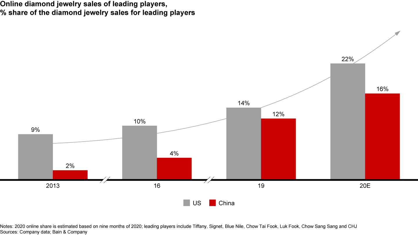 - The diamond value chain is becoming more digital, although brick-and-mortar stores still have value. A digital pipeline for business-to-business (B2B) commerce emerged during the pandemic as several platforms (UNI diamonds, Get-Diamonds, Clara Diamond Solutions) started or expanded trading of rough and polished diamonds. Business-to-consumer e-commerce also grew in 2020, with about 20% of retail sales occurring online. Major diamond jewelry retailers posted up to 60% to 70% year-over-year sales growth in their online channels. Despite the increase in online sales and a strong preference for online research before making purchases, nearly all consumers (90%−95%) still prefer to buy diamonds in brick- and-mortar stores. Consumers value the opportunity to see and touch jewelry, and they benefit from in-person advice and other personal services. The online share of diamond jewelry sales is still low compared with other luxury and consumer products. To create a meaningful shift toward digital channels, the industry needs to address several consumer concerns. It needs to improve trust (by providing diamond certificates, warranties, and reviews), enhance convenience (e.g., implementing free delivery and returns or “try before paying” programs), and provide additional discounts and promotions for online purchases.