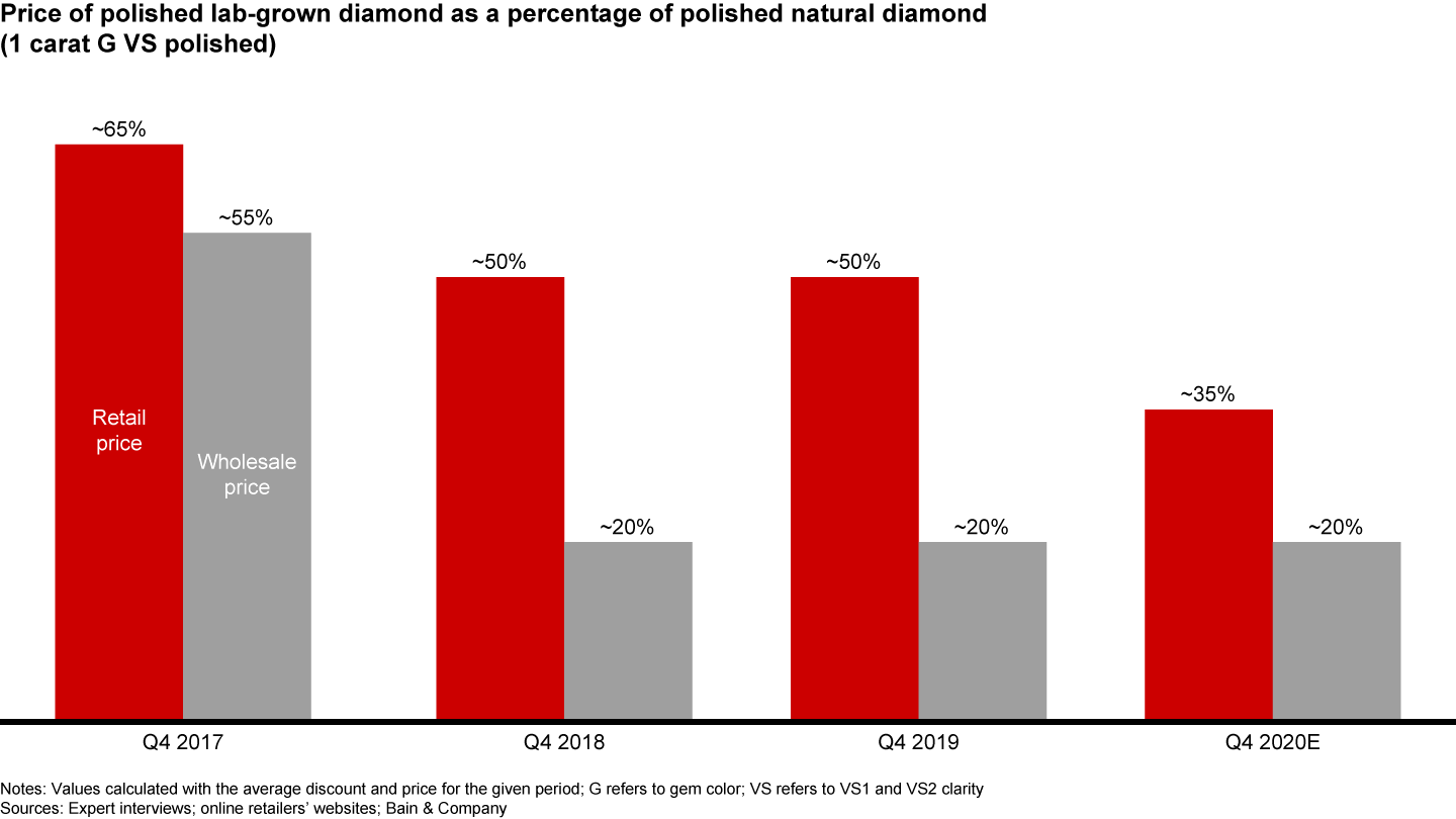 - Continued advances in technology contributed to double-digit growth in production and lower retail prices for lab-grown diamonds in 2019 and 2020. The price differential between natural and lab-grown fancy color diamonds is particularly striking—up to 10 times. In addition to independent lab-grown manufacturers, major fashion jewelry retailers are adding lab-grown diamonds to their product offerings, further positioning the category into the fashion jewelry segment and making it accessible to a wider range of price-sensitive consumers.