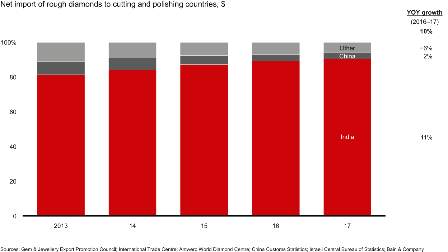 • Because of its low labor costs, favorable regulatory environment and relatively easier access to financing, India continued to gain market share in 2017. India’s growth came primarily at the expense of China and other countries. India accounts for more than 90% of global polished diamond manufacturing by value, and it dominates in all size segments, including the value-add segment of larger stones.
