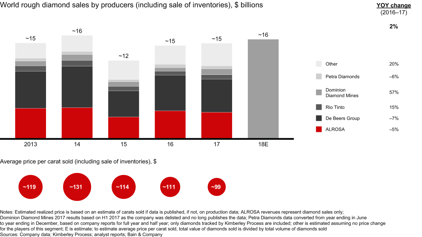 Rough diamond production grew by 19% in 2017, and may decline slightly in 2018