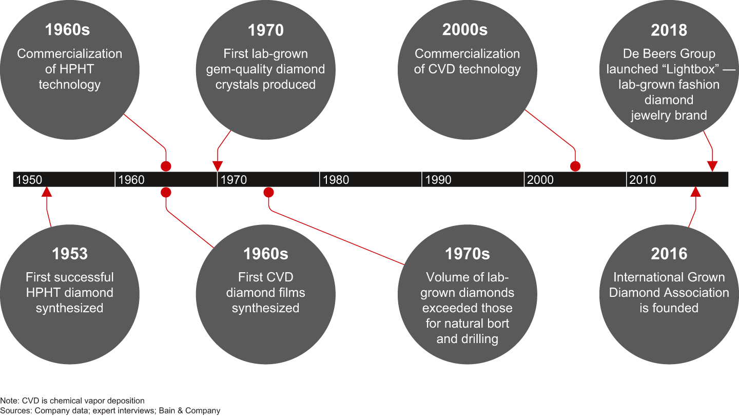 - Lab-grown diamonds have existed for more than 60 years, with limited effect on the natural gem-quality market. But advancements in technology have pushed the lab-grown market into a more competitive position. Most notably, new chemical vapor deposition (CVD) technology deeply cut the cost to produce larger, higher-quality diamonds. Today, it costs $300 to $500 per carat to produce a CVD lab-grown diamond, compared with $4,000 per carat in 2008.