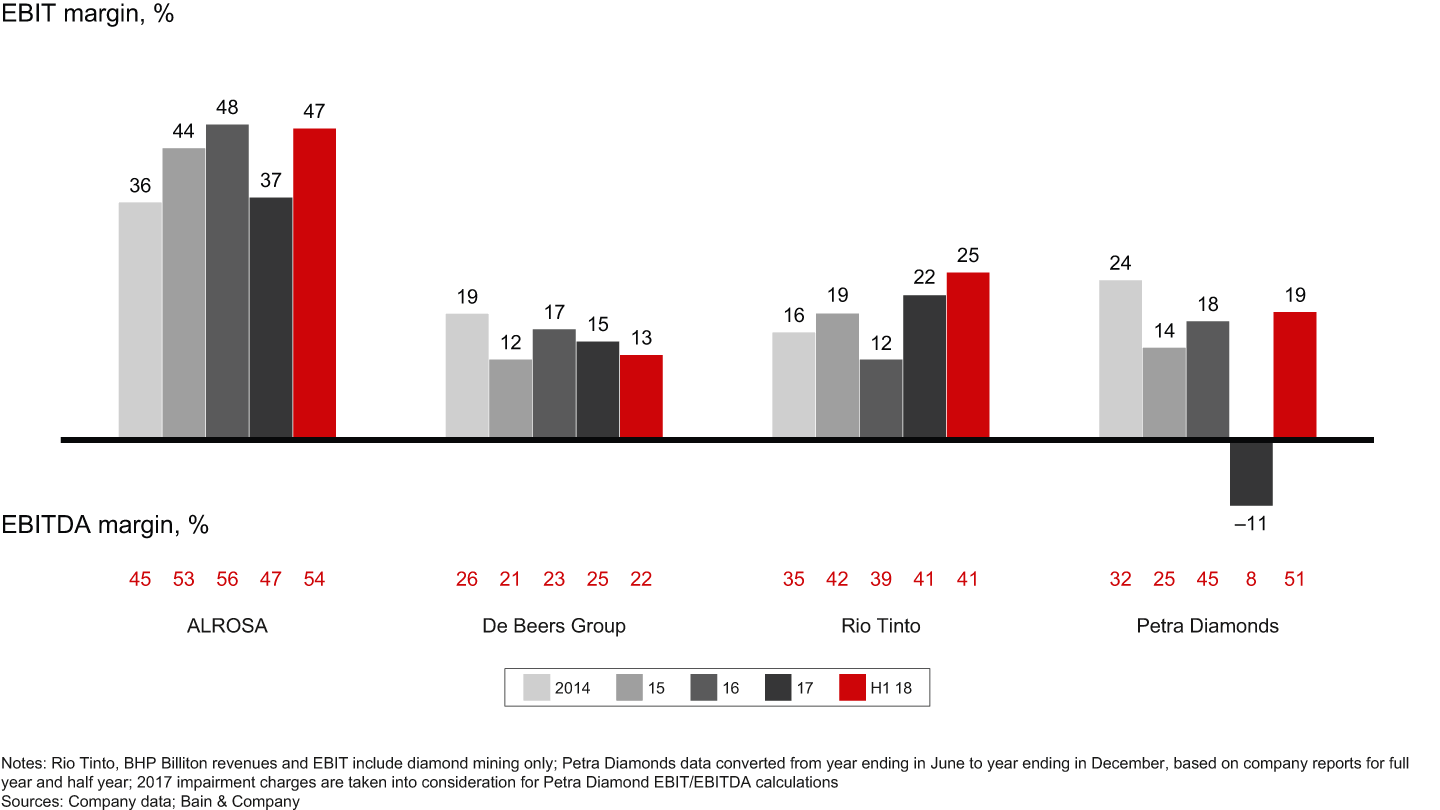 • Currency adjustments in production countries lowered the EBIT margins (earnings before interest and taxes) for De Beers Group and ALROSA in 2017. ALROSA returned to positive in the first half of 2018 and maintains the highest margin in the segment, attributable to rises in rough diamond prices, currency devaluation and strong cost containment. Petra reported negative EBIT margin in 2017 but rebounded in 2018.