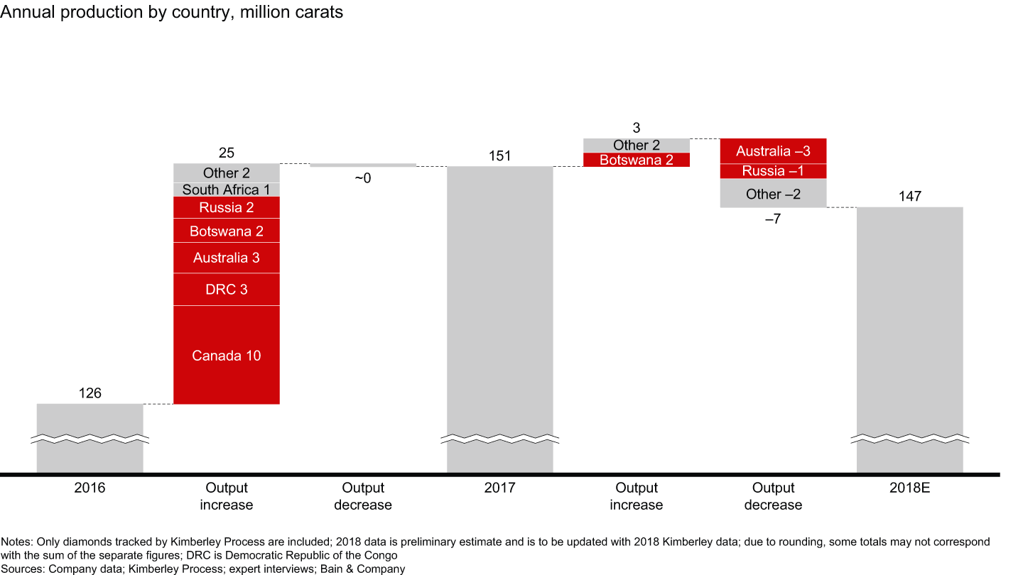 • Canada, the Democratic Republic of the Congo, Australia, Botswana and Russia accounted for 90% of the output increase in 2017. Canada led the way, with the largest production increases coming from commercial mining efforts in Gahcho Kué and Renard, both of which started production in 2016 and early 2017.