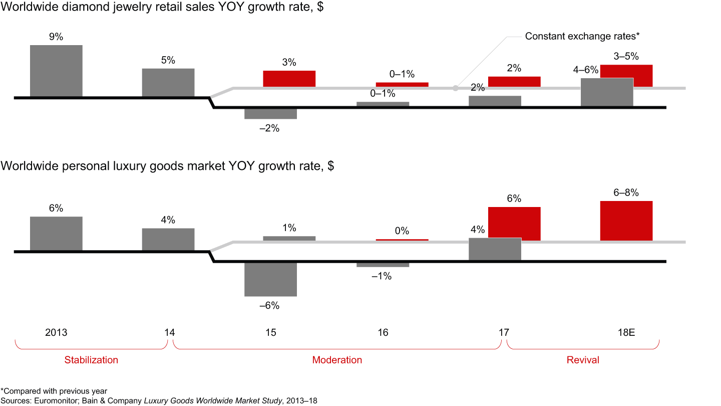 • The luxury category has been stable compared with global GDP for the past five years, marking a resilience to generational shifts. The luxury segment has adapted to changing consumer preferences and behavior. Keeping in line with luxury market trends, global diamond jewelry sales grew 2% in US dollar terms in 2017. Demand for diamond jewelry is expected to continue or even accelerate in 2018, steered by high demand from affluent consumers.