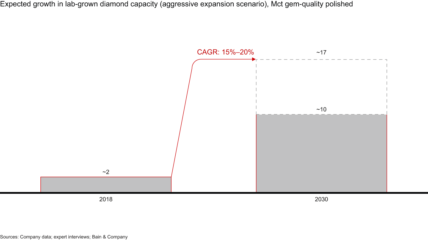 - The current gem-quality, lab-grown polished diamond capacity is estimated at 2 million carats, the majority of which is melee (diamond size less than 0.18 carats). By 2030, the market could grow to between 10 million and 17 million carats, if the segment can sustain its current growth rate of 15% to 20% annually supported by consumer demand and attractive economics. But we believe manufacturing capacity will be a major limiting factor in the short to medium term.