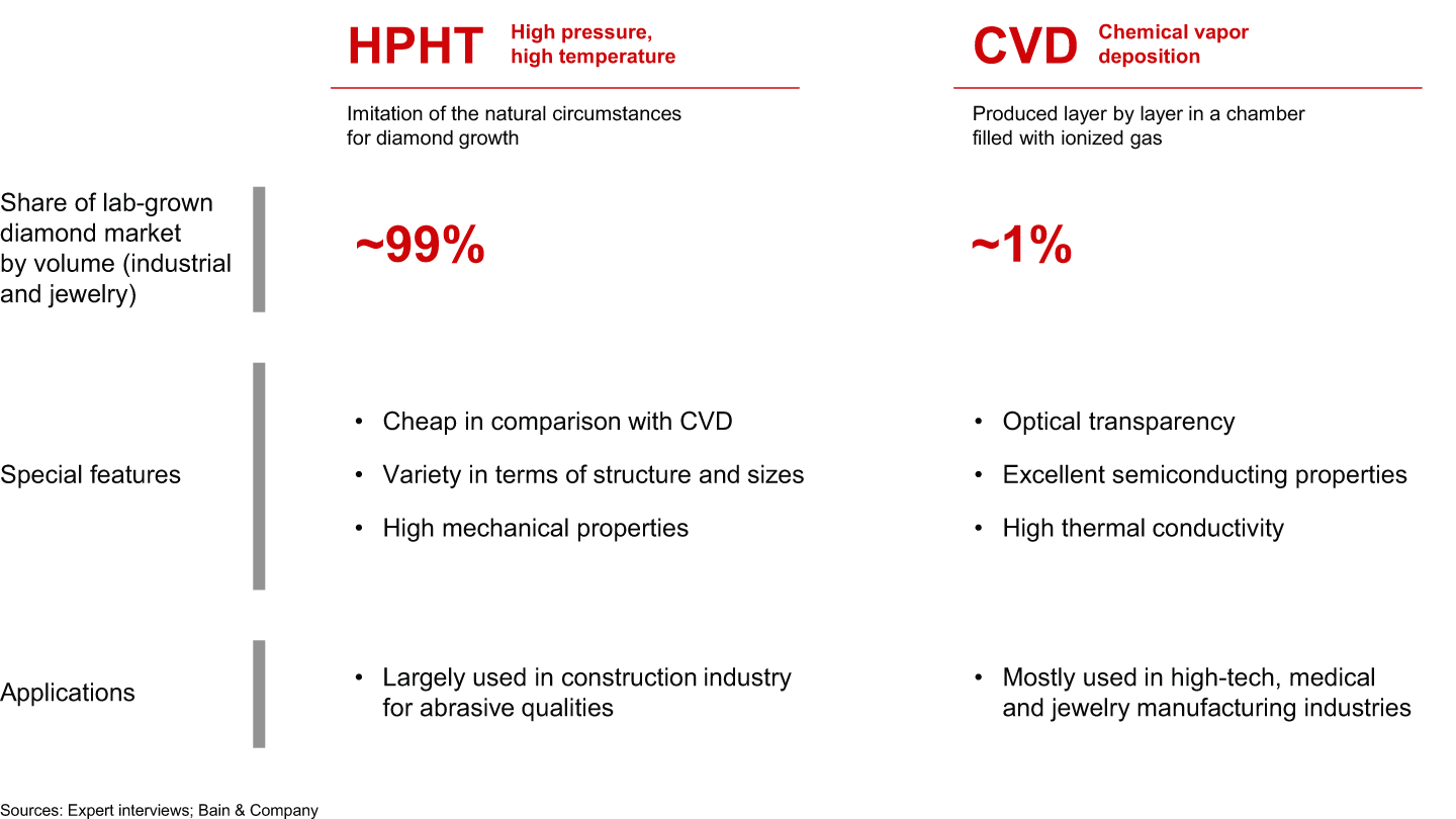 • Lab-grown diamonds have existed for more than 60 years, with limited effect on the natural gem-quality market. But advancements in technology have pushed the lab-grown market into a more competitive position. Most notably, new chemical vapor deposition (CVD) technology deeply cut the cost to produce larger, higher-quality diamonds. Today, it costs $300 to $500 per carat to produce a CVD lab-grown diamond, compared with $4,000 per carat in 2008.