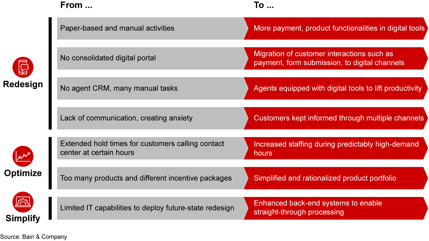 - Reducing bad volume, offering more self-service options for basic transactions and rationalizing the product mix can deliver a better experience at lower cost.