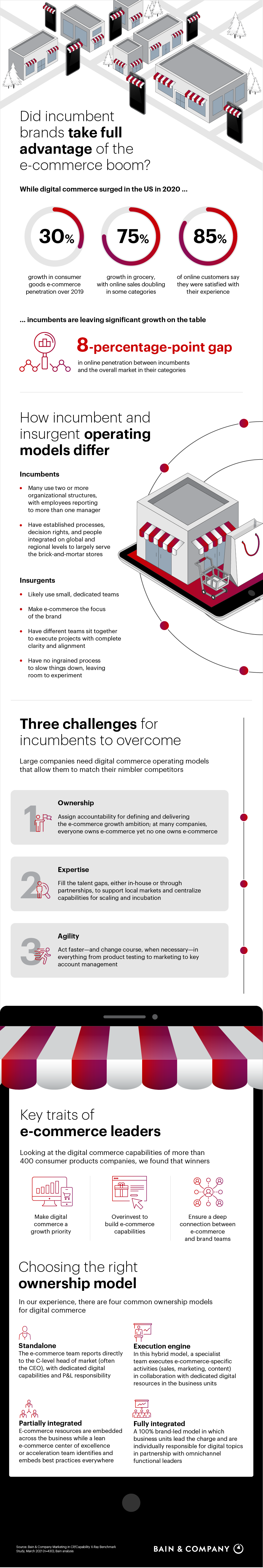 Infographic How Big Brands Can Adapt to Seize the E-commerce Opportunity To reach their digital growth potential, incumbent brands will have to abandon yesterday’s operating model. By Shweta Bhardwaj, Nicolas Bloch, and Eileen Shy Infographic How Big Brands Can Adapt to Seize the E-commerce Opportunity en Authors Shweta Bhardwaj Partner, Boston Nicolas Bloch Partner, Brussels Eileen Shy Partner, New York Contact us First published in septiembre 2021 Tags Consumer Products Operating Model & Org Design