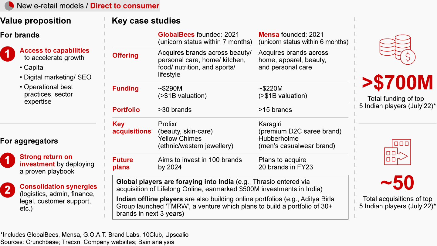 • Direct to consumer (D2C) commerce: India has witnessed a massive scale-up of online-first brands across categories. These brands have garnered more than $2 billion in funding between fiscal years 2015 and 2021.