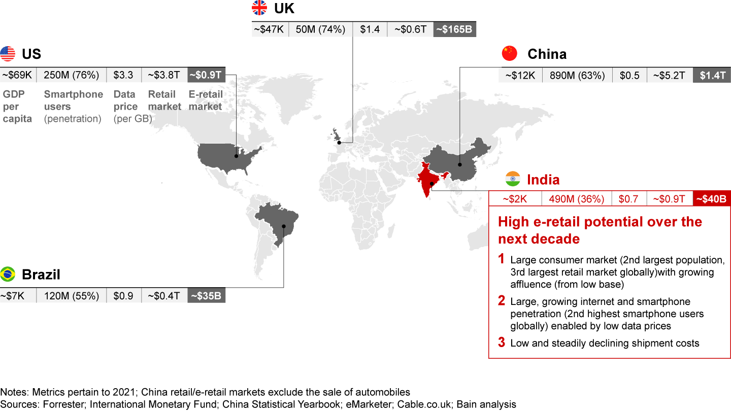 India’s e-retail market rose to approximately $40 billion in 2021 and is slated to reach $50 billion in 2022. India has robust fundamentals supporting a continued boom in e-retail. India’s substantial online consumer base and retail market (third largest globally) already make it an incredibly attractive e-retail market. Massive headroom in terms of smartphone penetration (36% in India vs. 63% in China and 76% in the US) and affluence (~$2K per capita in India vs. ~$12K in China and ~$69K in the US), in addition to already low data prices, provide the perfect ingredients for sustained growth.