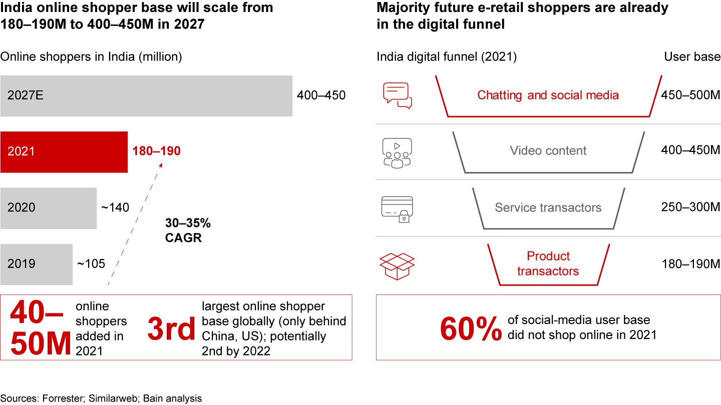 Shopper addition will continue to be at the heart of future e-retail growth. India’s online shopper base is estimated to increase to 400–450 million by 2027. Most of these shoppers are already in the digital funnel—450–500 million used social media while only 180–190 million shopped online in 2021.