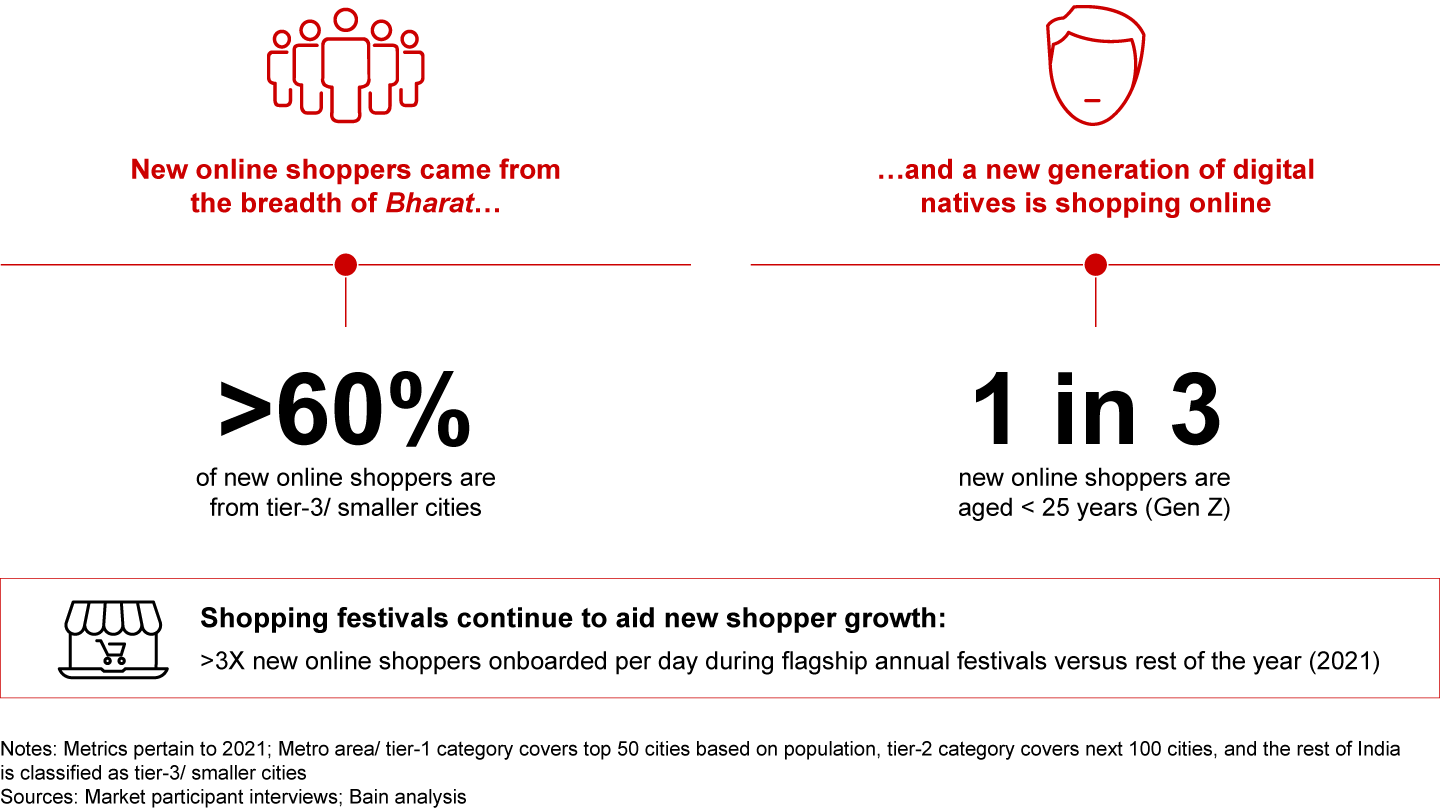 In 2021 alone, between 40 and 50 million new shoppers were added to the India e-retail market, which is approximately 30%–35% growth over the online shopper base in 2020. These new shoppers largely belong to tier-3 or smaller cities and include Gen Z—which will become a critical cohort in the future. They primarily purchase fashion as the first category online, and they typically start buying at entry price points.