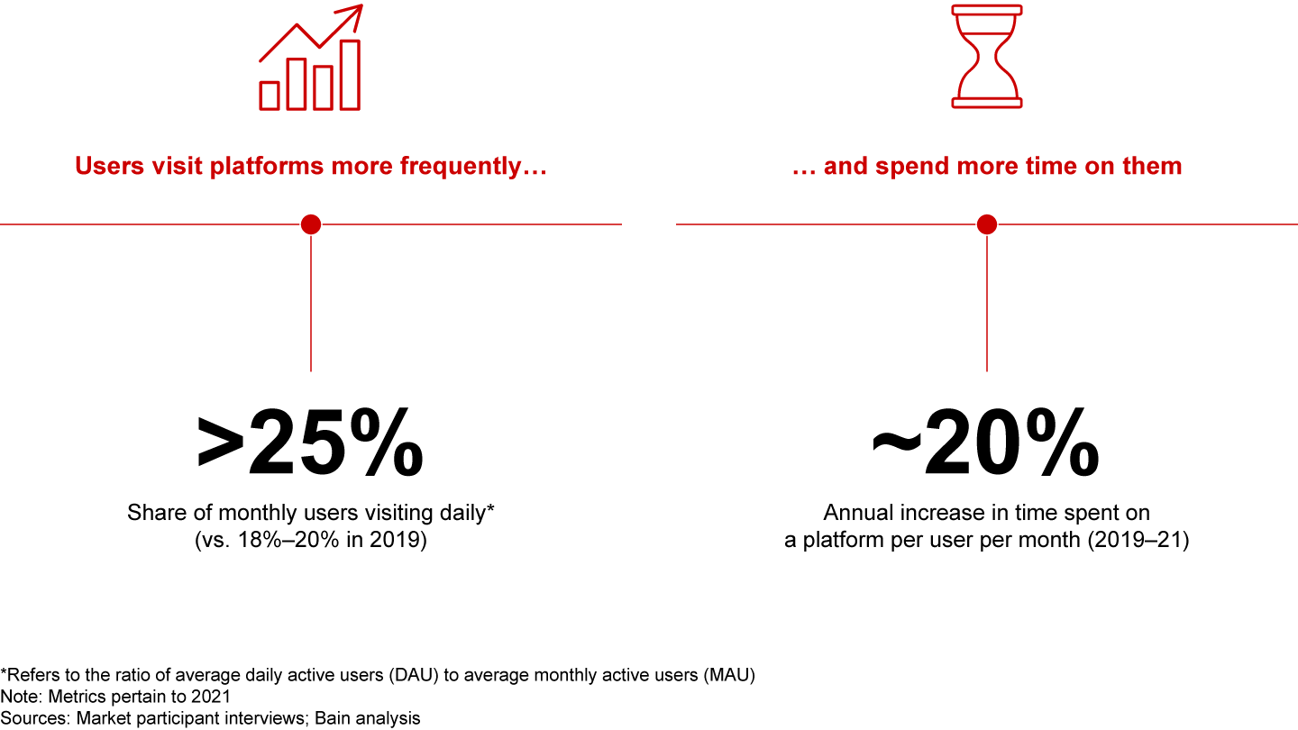 The existing shopper base is simultaneously maturing. Overall engagement on retail platforms is increasing. The percentage of daily active users to monthly active users has risen to more than 25% in 2021, from 18% to 20% in 2019. Consumers now spend 20% more time per month on a retail platform, vs. last year.