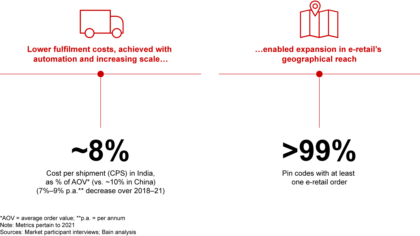 Sustained e-retail growth has been accompanied by tremendous growth in the supplier and logistics ecosystem. India’s online seller base has grown 35% annually over the past year, with approximately 40% of new sellers coming from tier-2 or smaller cities. In addition, growth in e-retail shipments has enabled the development of a deep and efficient logistics network. Accompanied by technological advances, e-retail has seen a steady year-over-year decline in cost per shipment by 7%–9% per annum from 2018 to 2021. Reach has widened significantly—e-retail is accessible in 99% of India’s pin codes.