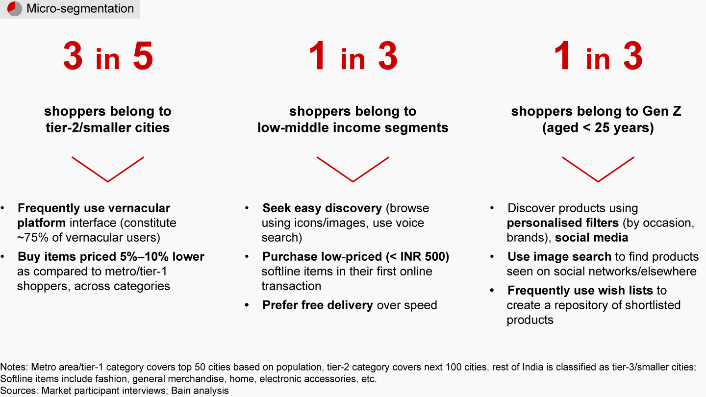 Shopper micro-segments: Multiple disparate shopper cohorts—based on geography, income, and age—are coming online. Three out of five shoppers belong to tier-2 or smaller cities, one in three shoppers belong to low-to-middle income segments, and one in three shoppers is Gen Z (younger than age 25). Each of these micro-segments exhibits distinct shopping behavior. For instance, shoppers in tier-2 or smaller cities have higher salience of voice and vernacular search, whereas low-to-middle income households rely more on image-based search.
