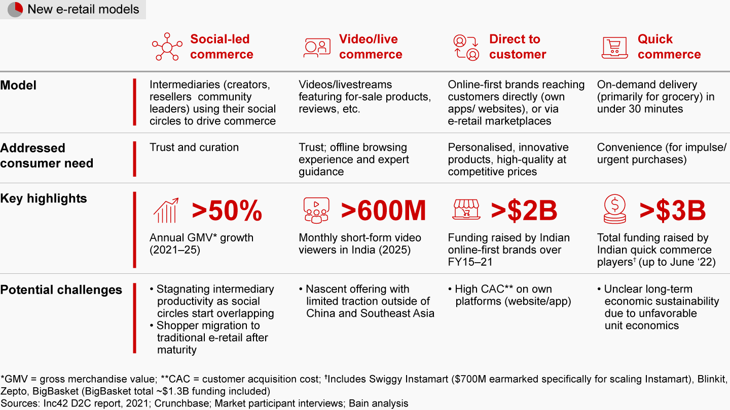 New e-retail business models: E-retailers are experimenting with a host of alternative business models as they pursue a wider audience and address gaps in traditional commerce. These models—social-led commerce, video/live commerce, direct-to-consumer commerce, and quick commerce—are at varying levels of maturity and demonstrate tremendous potential. For example, social-led commerce is expected to grow approximately 50% annually from 2021 to 2025. Social media players are increasingly looking to leverage platform traffic to drive online sales—about 10% of Instagram users globally use “Shops” on Instagram. Video/live commerce also offers substantial potential, with more than 600 million users of short-form video platforms expected in India by 2025. However, the model is yet to gain meaningful traction beyond China and Southeast Asia (video/live commerce drives 10% of China’s e-retail revenue). Quick commerce, a recent disruption globally, has also gained interest in India, with players having raised more than $3 billion in funding up to June 2022