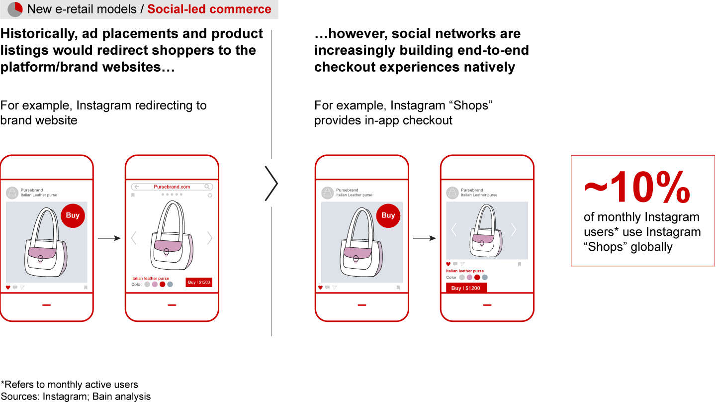 • Social-led commerce: Includes three models—social-network led, reseller-led, and community buying. About 40% of shoppers using the reseller model are first-time e-retail shoppers, and two-thirds of shoppers belong to tier-3 or smaller cities.