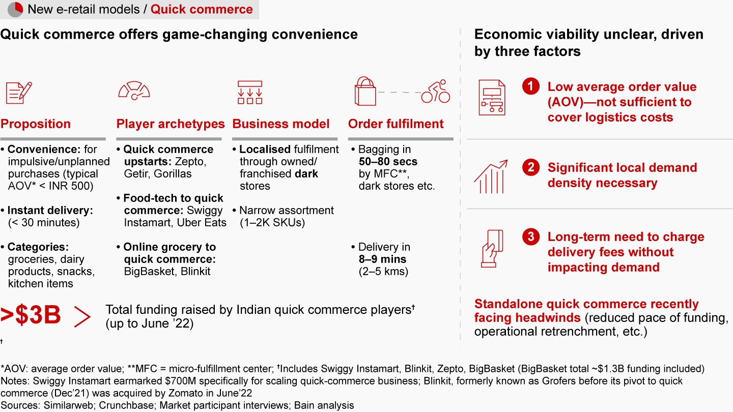 • Quick commerce: Q-commerce, a recent disruption globally, has gained interest in India. Indian Q-commerce players raised more than $3 billion in funding up to June 2022. However, long-term sustainability of the model (especially <15-minute model) is unproven, especially in the absence of delivery and/or convenience fees.