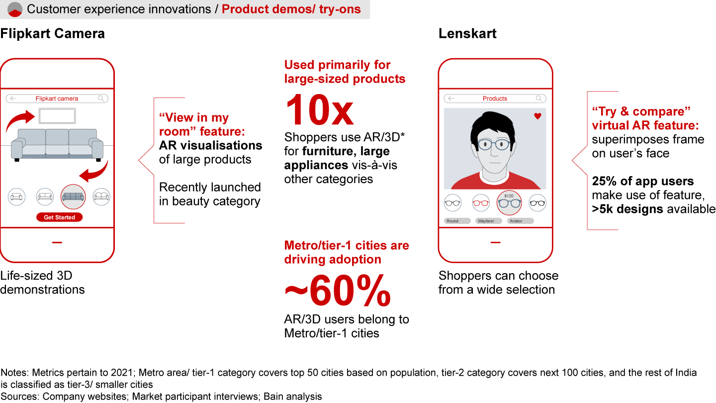 Customer experience innovations: Technology-led disruptions have tremendously enhanced the online shopper experience from discovery to purchase. These improvements range from innovative search mechanisms—voice, vernacular, and image-based search—to applications utilising augmented reality (AR), virtual reality (VR), and artificial intelligence (AI). Made-for-Bharat innovations such as voice- and vernacular-based search have continued to gain traction, with 5x growth in voice-search users and 3x growth in vernacular-search users over the past year. These innovations are helping make shopping easier for a new wave of users: Half of all vernacular-search shoppers are new online shoppers. Most of these vernacular shoppers (70%) belong to tier-3 or smaller cities. Simultaneously, AR/VR applications such as product try-ons and demos are gaining popularity. For instance, Flipkart’s camera feature allows users to superimpose images of furniture and large appliances on live videos of their rooms through camera scanning.