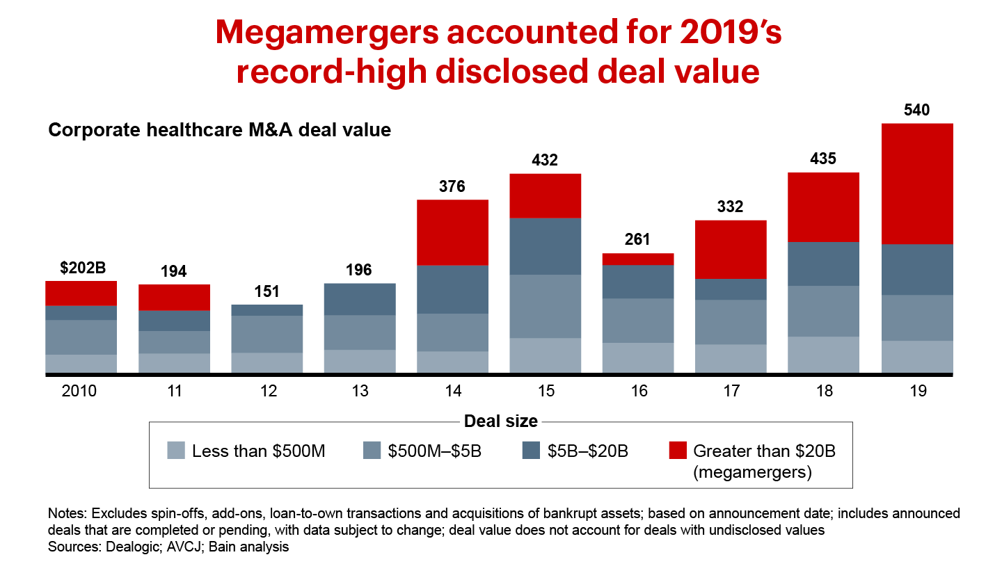 The disclosed value of healthcare corporate M&A rose by 25% in 2019, to a new high of $541 billion. Two megamergers—namely, Bristol-Myers Squib acquired Celgene, and AbbVie bought Allergan—totaled $182 billion. We expect brisk deal activity to continue in the near future as public healthcare companies use acquisitions to grow revenue, which public markets continue to reward differentially relative to profit margin expansion. New Bain & Company analysis of S&P Capital IQ data shows that revenue growth accounts for 62% of total shareholder returns over the past five years, a far more important factor than profit margin expansion, which accounts for only 9%.