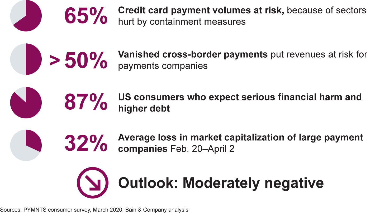 In the wake of its grim toll on health, the coronavirus has caused consumption in many industries to collapse. That, in turn, led the volume of payments for the restaurant, transportation, tourism and other sectors to plunge. Even some e-commerce categories ranging from clothes to furniture have gone quiet. Highly vulnerable sectors account for roughly two-thirds of consumer-to-business payment volumes worldwide, Bain & Company estimates.