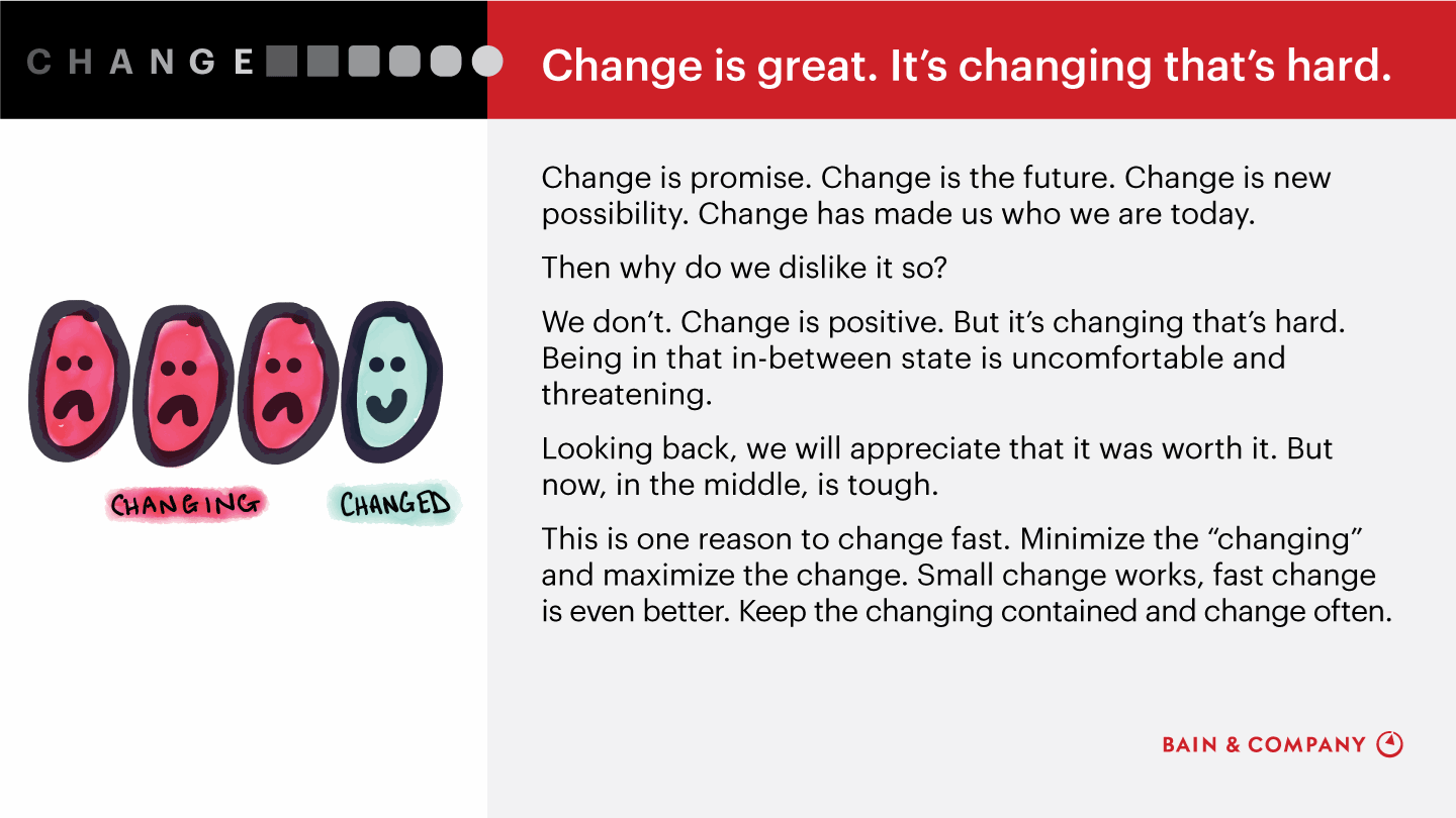 My colleague Kevin Murphy, an expert partner at Bain & Company, and I spend a lot of time talking and writing about change. We have each worked with companies across industries and geographies, and we feel we have seen the “the good, the bad, and the ugly” when it comes to corporate transformations. While each situation is unique, there are common principles that become clear the longer you do this kind of work. Understanding those principles makes managing change easier and more likely to succeed.