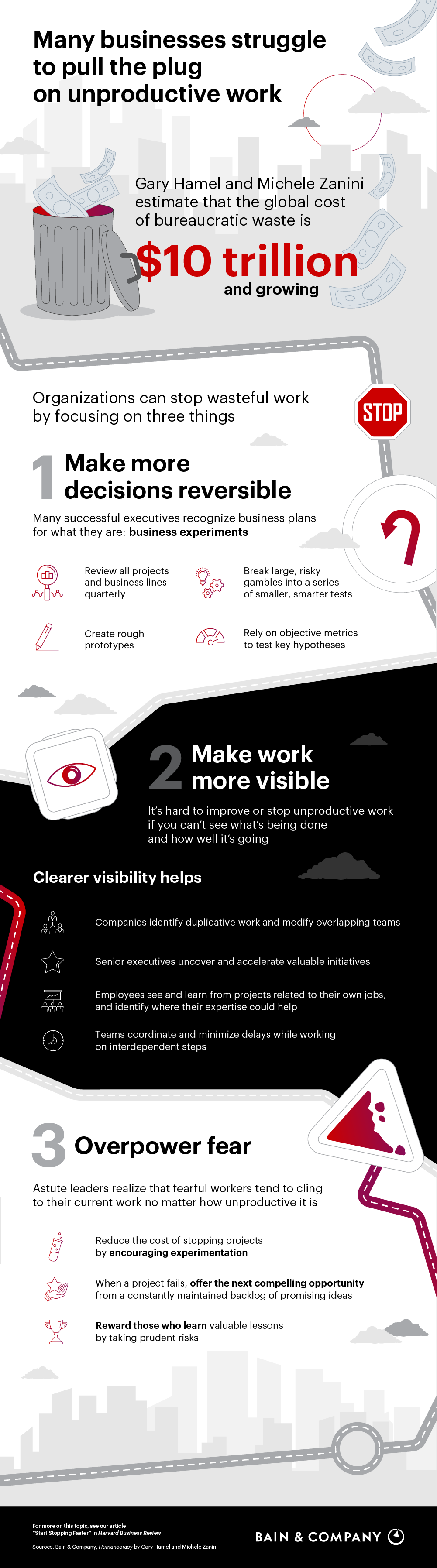 Infographic Three Steps to Stopping Work That Isn’t Working In a world of increasingly unpredictable change, running faster is not enough. Three actions can help businesses stop unproductive work and pivot to more promising options sooner. By Darrell Rigby, Sarah Elk, and Steve Berez Infographic Three Steps to Stopping Work That Isn’t Working en Read the article on HBR.org Start Stopping Faster Ending wasteful projects sooner will save money—and free you to pursue better opportunities. Authors Darrell Rigby Partner, Boston Sarah Elk Partner, Houston Steve Berez Advisory Partner, Boston Contact us First published in septiembre 2021 Tags Agile Agile Enterprise