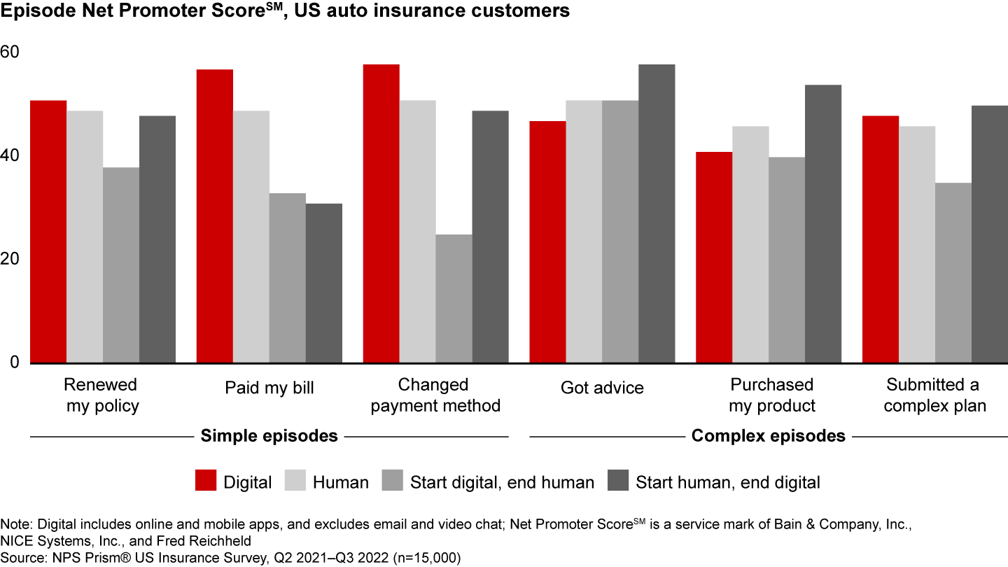 Improving digital self-service thus has become a pressing issue. Communicating with a human will remain important, but not for simple transactions best handled digitally. Consumers want to speak with an agent for more complex or sensitive issues, Bain NPS Prism® survey data shows.