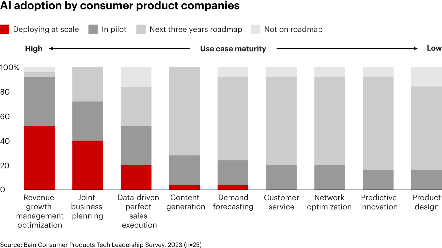 Consumer product companies are at different stages of deploying artificial intelligence (AI) to improve their business decisions and operational efficiency. While roughly half of the companies we surveyed are scaling their use of the technology to make advances in commercial excellence, a few are starting to pilot AI to enhance innovation and product design. As we’ve seen with past disruptions, those that avoid the trap of sporadic investing and that instead invest strategically and build capabilities early on will create a source of competitive advantage in the midterm. Most critical to success will be setting a clear strategic vision for business use cases in which AI can address the greatest unmet needs (for consumers, customers, and employees), determining how that will enable the company to differentiate, and navigating the appropriate sequence of stepping stones necessary to get there.