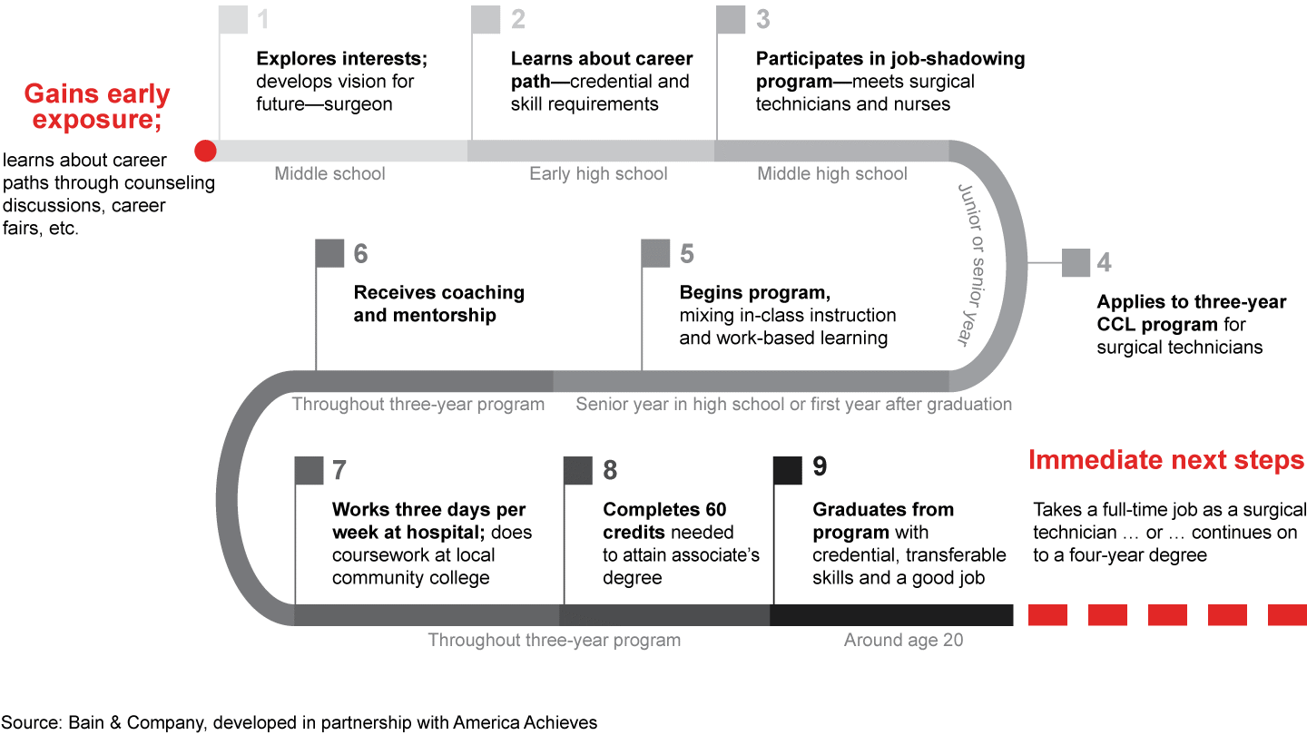 During the summer before her junior year, Camila participates in a job-shadowing program at a local CCL-affiliated medical center. She spends time in a hospital, shadowing people in multiple roles from surgeon to nurse to radiology technician to surgical technician. She begins to recognize that she might not be ready financially or academically to pursue a four-year degree followed by medical school. But she loves the hospital work and hears about a three-year CCL pathway to become a surgical technician—a job that could be a springboard to a number of careers in healthcare. She applies and gets in.