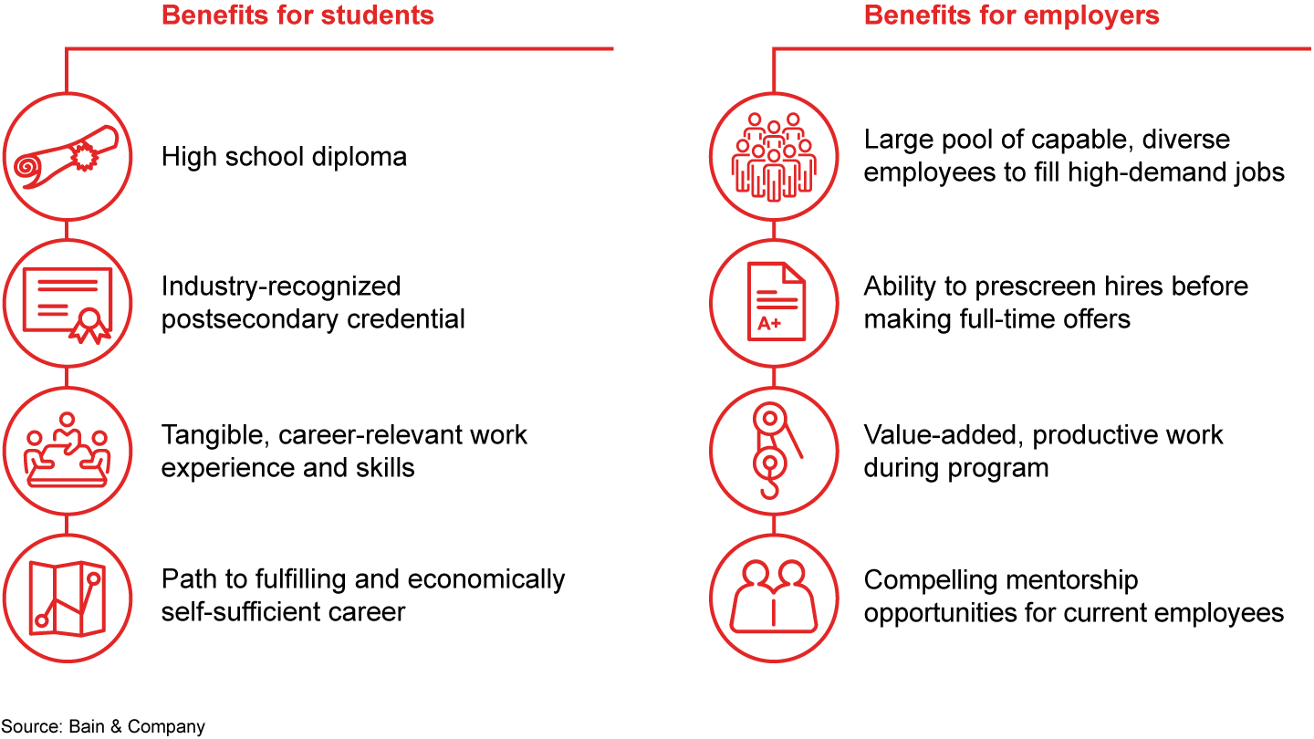 For employers, a CCL system needs to attract and prepare highly motivated students who will take full advantage of the opportunities provided and succeed in the workplace. Not all students who apprentice will join their employers full time—CCL programs should be designed to enable multiple pathways. But for career-connected learning to scale, it must appeal to companies as an attractive and efficient way to identify and develop talent.