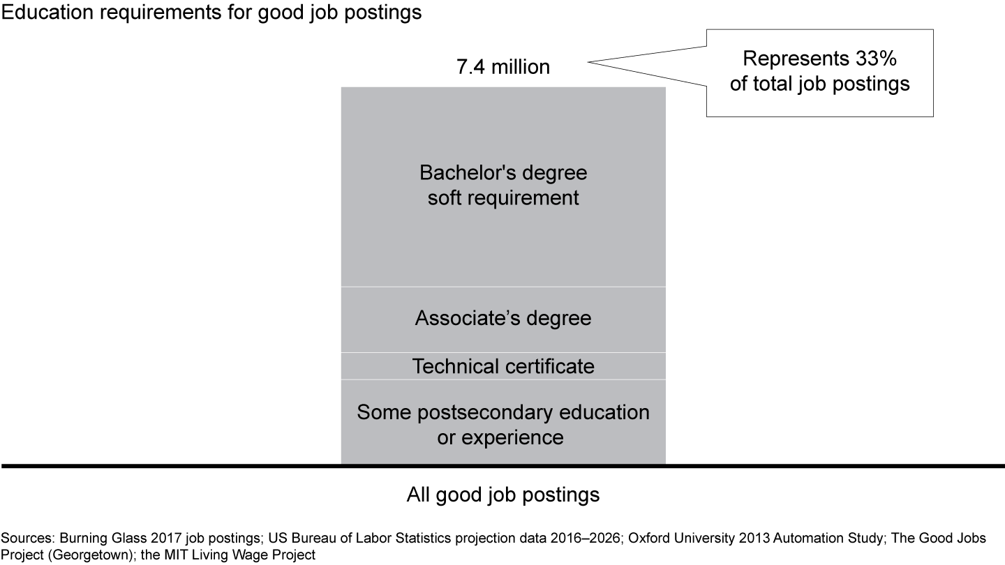 Our research showed that most of these jobs require some postsecondary training or education but that a four-year degree is not necessarily essential. Approximately half of all advertised good jobs required less than a bachelor’s degree, while the remainder had a soft requirement for a four-year degree (see Figure 2.4). By “soft,” we mean that some of these postings had a bachelor’s degree requirement but that other very similar postings did not. This indicates that many employers are asking for a college degree as a screening mechanism, even if the jobs themselves don’t really require the skills or knowledge developed in a specific undergraduate degree. These findings run counter to the conventional wisdom that a college degree is becoming more and more important to attain good jobs.