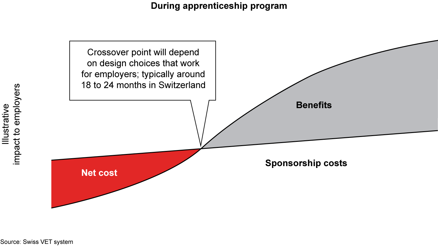 In addition to solving a tangible business need, a sustainable CCL program ultimately has to generate a positive return on investment (ROI) for employers. Meaningful career launch programs require a significant employer investment in student wages, supervisory and mentor time, tuition reimbursement and internal program management. In return, employers want to be able to see real benefits, both in terms of stronger talent pipelines and measurable value flowing from the work students do as part of the CCL program. Positive ROI during the program is a core component of the Swiss system. The Swiss government closely monitors ROI, studying the results from companies that participate in the program and comparing them with those that don’t. This process helps the system identify best practices, continuously improve and ensure that employers are seeing returns. Importantly, the system has been able to demonstrate that the productive output generated by student learners during their apprenticeships allows Swiss companies to realize a net benefit from their participation (see Figure 3.4).