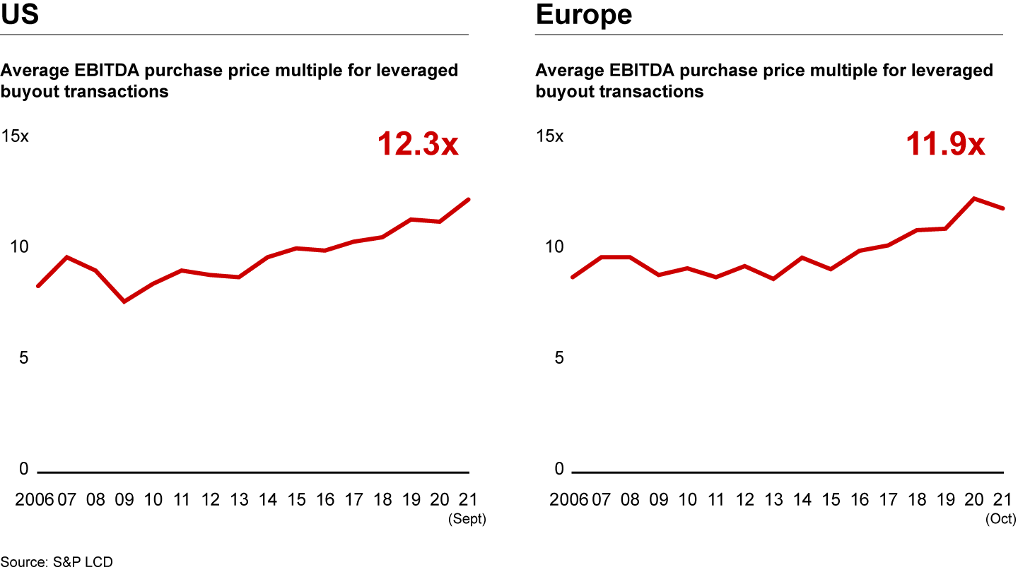 So is this year’s spike in P2P activity cause for concern? The impact of these deals was significant in both periods. In 2006, take-private transactions in the US made up around 91% of the sudden increase in value from 2005; in 2021, they accounted for 42% of the increase. Investors paid rich multiples for these companies in both time periods, but valuations in 2021 were actually higher: Multiples paid on P2P deals in 2007 on an enterprise value (EV) basis were 12.6 times earnings before interest, taxes, depreciation, and amortization (EBITDA)—or 1.3 times the market average. In 2021, P2P multiples were 19.3 times EV/EBITDA, or 1.6 times the average.