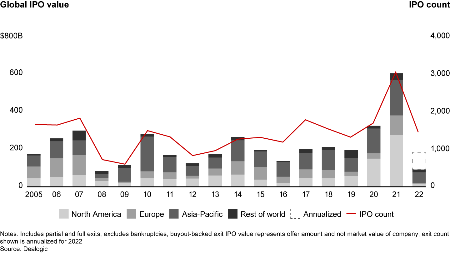 Public market woes in 2022 have already had an impact on exits given that the market for initial public offerings (IPOs) has all but dried up. Global buyout-backed exit value hit $338 billion in the first six months of the year, a decline of 37% from the same period a year ago (see Figure 4a). Global IPO value, including buyout-backed and other, came in at $91 billion, a 73% decline vs. the first half of 2021 (see Figure 4b). As this period of turbulence wears on, the slowdown will likely extend to exits across the board. Notably, the first-half buyout number does not include exits in growth equity and venture capital investments, where the drop in technology valuations will have the largest impact.
