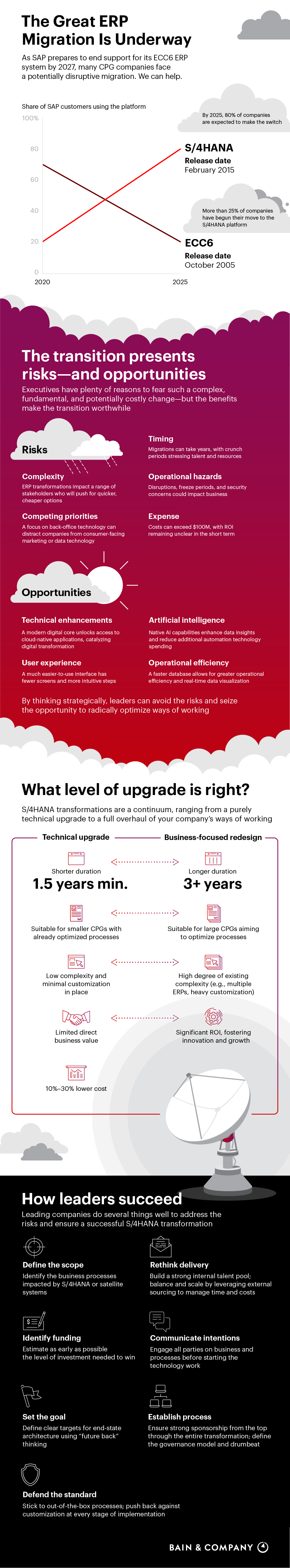 Infographic Now Is the Time for Transformative ERP Migration Leading consumer products companies are moving to S/4HANA, SAP’s newest cloud-based platform for enterprise resource planning. When and how should you start your own journey? Par Florian Braun, Skylar Shephard, Sarah Boice, et Markus Puttlitz Now Is the Time for Transformative ERP Migration Auteurs Florian Braun Partner, London Skylar Shephard Partner, Amsterdam Sarah Boice Partner, Atlanta Markus Puttlitz Expert Associate Partner, Berlin Contactez-nous Mots clés CIO Insights Digitalization in CPG Finance Function Advantage Grande Consommation Systems & Architecture Technologies de l'information