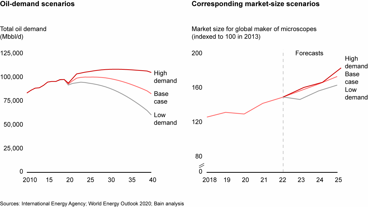 A key step in the fund’s diligence was to model potential demand scenarios for each of the industries the target serves and evaluate the implications on market and revenue forecasts. For the oil and gas end market, the diligence team defined potential scenarios for oil demand (base case, low demand, and high demand), taking into account macroeconomic factors such as global GDP growth and industry-specific factors including the growing number of electric vehicles, demand from plastic production, and plastics recycling. Based on the different scenarios for oil demand, the team calculated three corresponding market forecasts (see Figure 26). That enabled the target to create action plans tailored to low-, medium-, and high-growth scenarios, and to understand the company's best performance potential in each one.