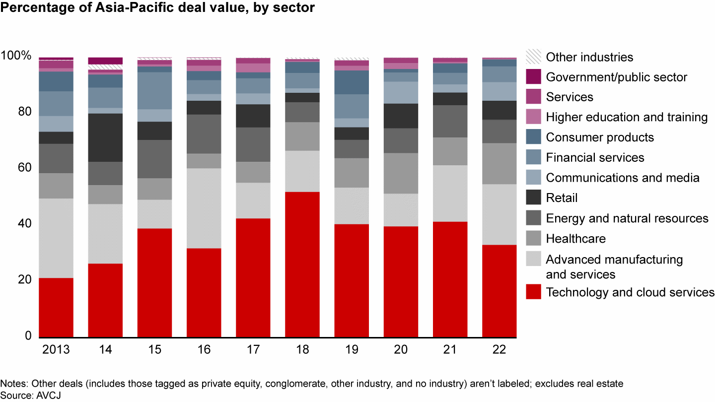 Advanced manufacturing and energy and resources were the only sectors that had more deals in 2022. That shift reflected investors’ preference for companies with a low-risk profile that generate steady cash flow. At the same time, government demand for private capital investment to develop and upgrade critical infrastructure including utilities, telecommunications, and transportation remains strong, especially in Southeast Asia and India.