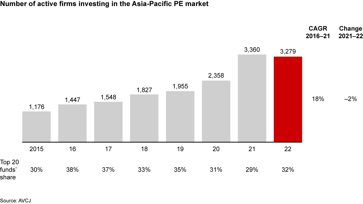 Turbulent market conditions and uncertainty pushed less-competitive investors to the sidelines in 2022. The number of active investors dipped 2%, the first decline since 2015. The top 20 investors accounted for 32% of deal value, up slightly. Fund-raising also suffered. The total capital raised by Asia-Pacific-focused funds fell 43% to $105 billion, and on average, GPs needed more time to close new funds. However, global and regional flagship funds that have strong track records and local operations were less affected.